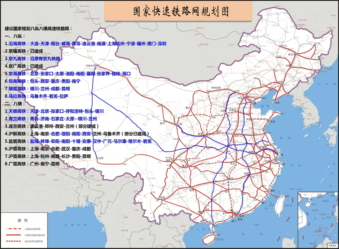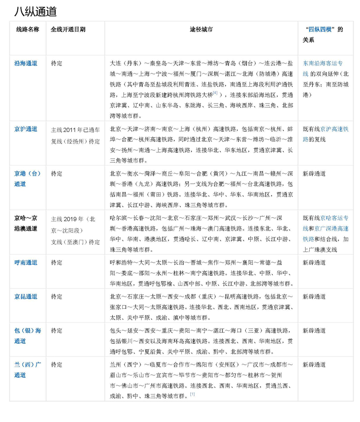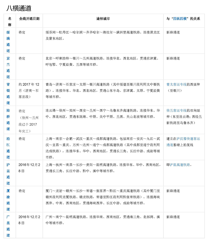 "八縱八橫" 是中國(guó)高速鐵路網(wǎng)絡(luò)的短期規(guī)劃圖。2016年7月,國(guó)家發(fā)展改革委、交通運(yùn)輸部、中國(guó)鐵路總公司聯(lián)合發(fā)布了《中長(zhǎng)期鐵路網(wǎng)規(guī)劃》,勾畫(huà)了新時(shí)期“八縱八橫”高速鐵路網(wǎng)的宏大藍(lán)圖。 “八縱”通道包括沿海通道、京滬通道、京港(臺(tái))通道、京哈~京港澳通道、呼南通道、京昆通道、包(銀)海通道、蘭(西)廣通道。“八橫”通道包括綏滿通道、京蘭通道、福銀通道、青銀通道、陸橋通道、沿江通道、滬昆通道、廈渝通道、廣昆通道。